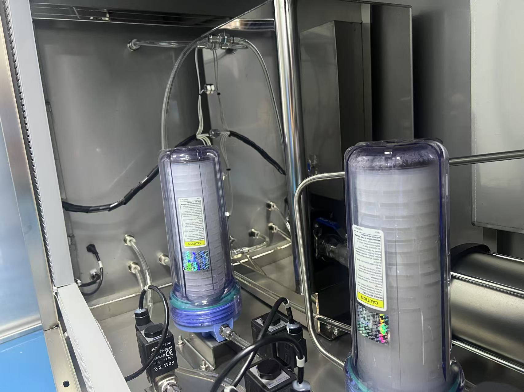 رُكِّب مُرشِّحان للسائل داخل الجهاز، ويُفرَّغ مُركَّب التنظيف من خزان التخزين عبر مضخة مضغوطة. يمرُّ المُركِّب عبر عنصر ترشيح دقيق بقطر 0.2 ميكرون لضمان نظافة السائل المُستخدَم في تنظيف المُكوِّنات. قبل إعادة مُركِّب التنظيف إلى خزان التخزين عبر تحضير العينة بالغشاء، يُرشَّح بقطر 1.0 ميكرون لضمان نظافة السائل الموجود في خزان التخزين.